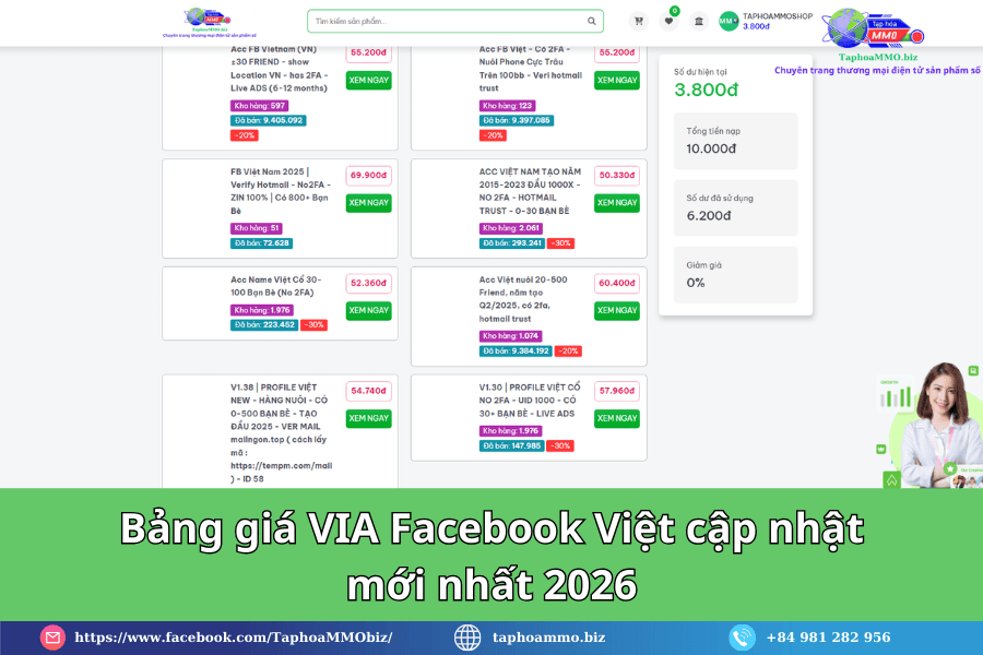 Trong bối cảnh thị trường quảng cáo trực tuyến năm 2026 đầy biến động, việc nắm bắt chính xác giá VIA Facebook Việt là chìa khóa để các nhà bán hàng tối ưu chi phí vận hành. Mỗi loại tài khoản (VIA) đều có mức giá và công năng riêng biệt, phù hợp với từng giai đoạn lên camp hoặc nuôi dàn tài khoản.